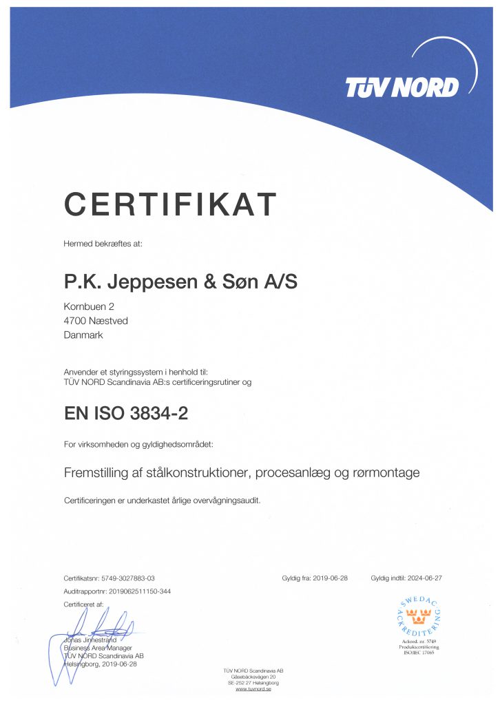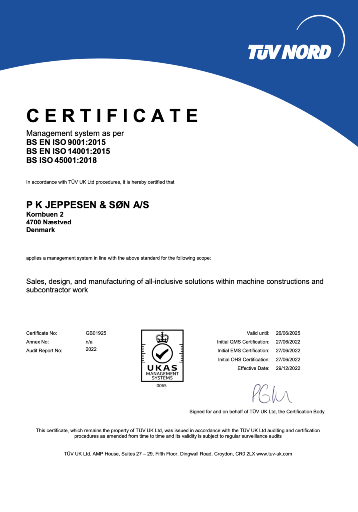 Hos Maskinfabrik P.K. Jeppesen går vi ikke på kompromis med kvaliteten – kun det bedste er godt nok. Derfor har vi som virksomhed valgt at blive ISO-certificerede. Det har vi gjort for at kunne dokumentere vores kompetencer og sikre vores kunder en høj, ensartet kvalitet i alt, hvad vi leverer.